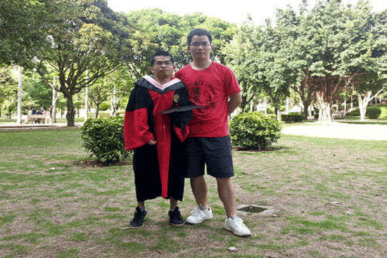 穿博士服的黃云凌在廈大與學(xué)弟合影,圖片由受訪者提供
